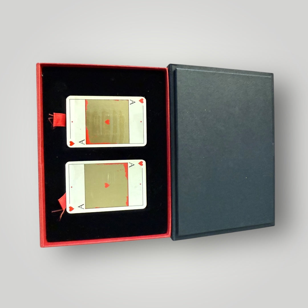 Édition artistique rare du peintre Egbert Moehsnang. Ce coffret luxueux contient deux jeux de cartes Patience aux motifs dorés, présentés dans un écrin raffiné. Une pièce de collection unique, idéale pour les amateurs d’art et d’objets d’exception.