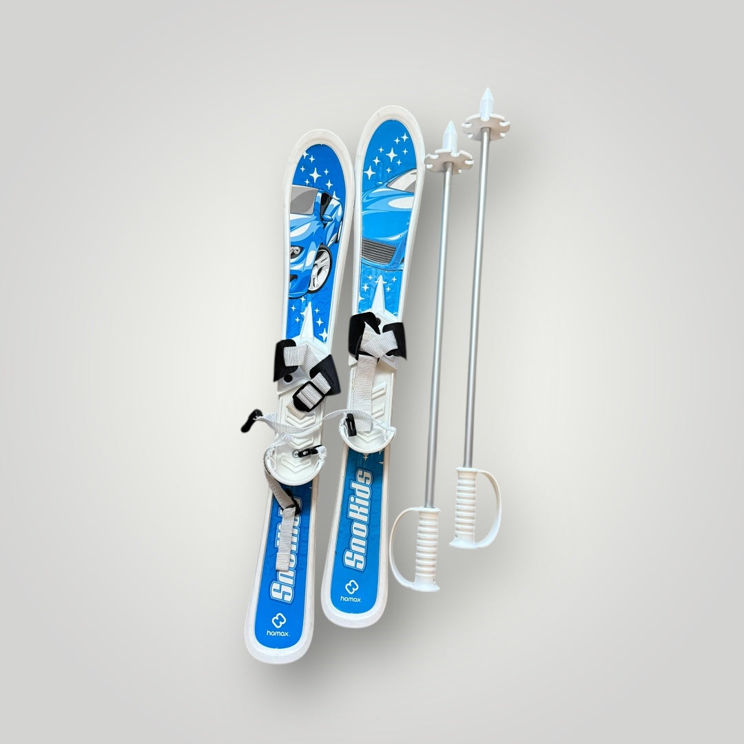 Set de skis pour enfants Snokids, design bleu dynamique. Fixations faciles d’usage et bâtons inclus. Idéal pour initiation.