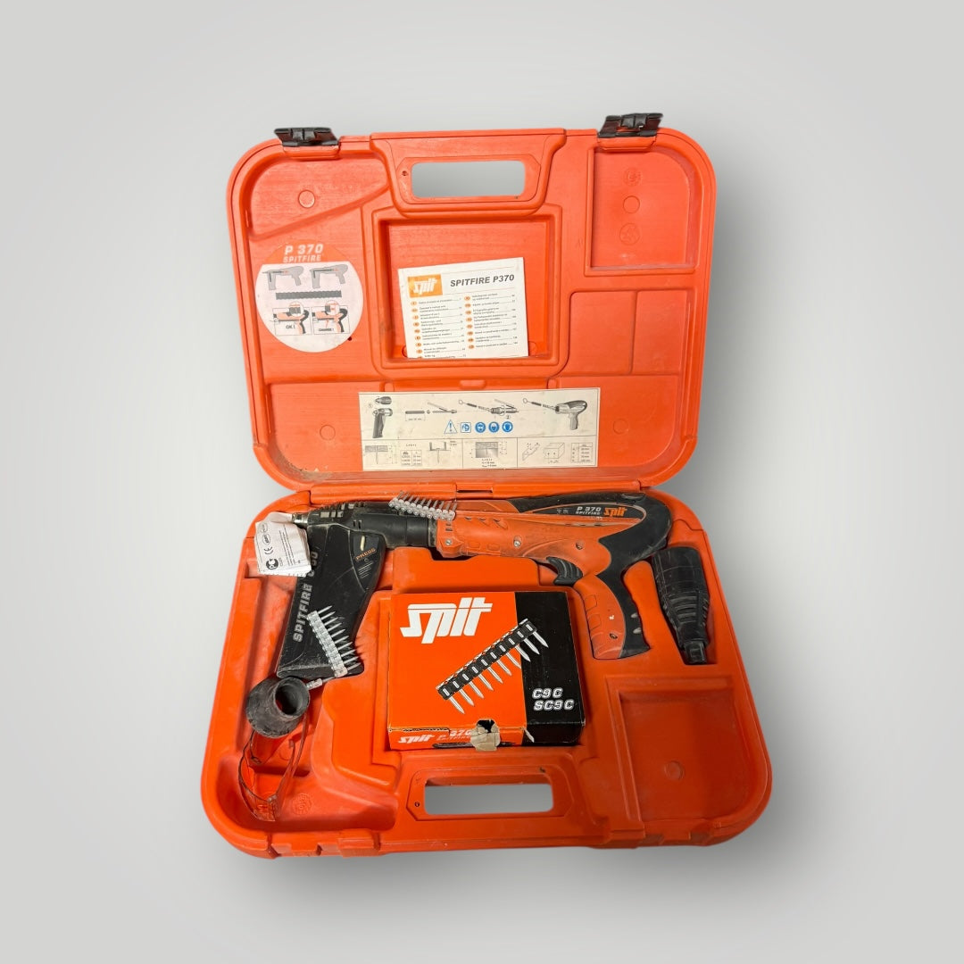 Outil Spitfire P370 livré dans sa mallette d’origine avec accessoires. Convient à la fixation rapide sur chantiers professionnels.